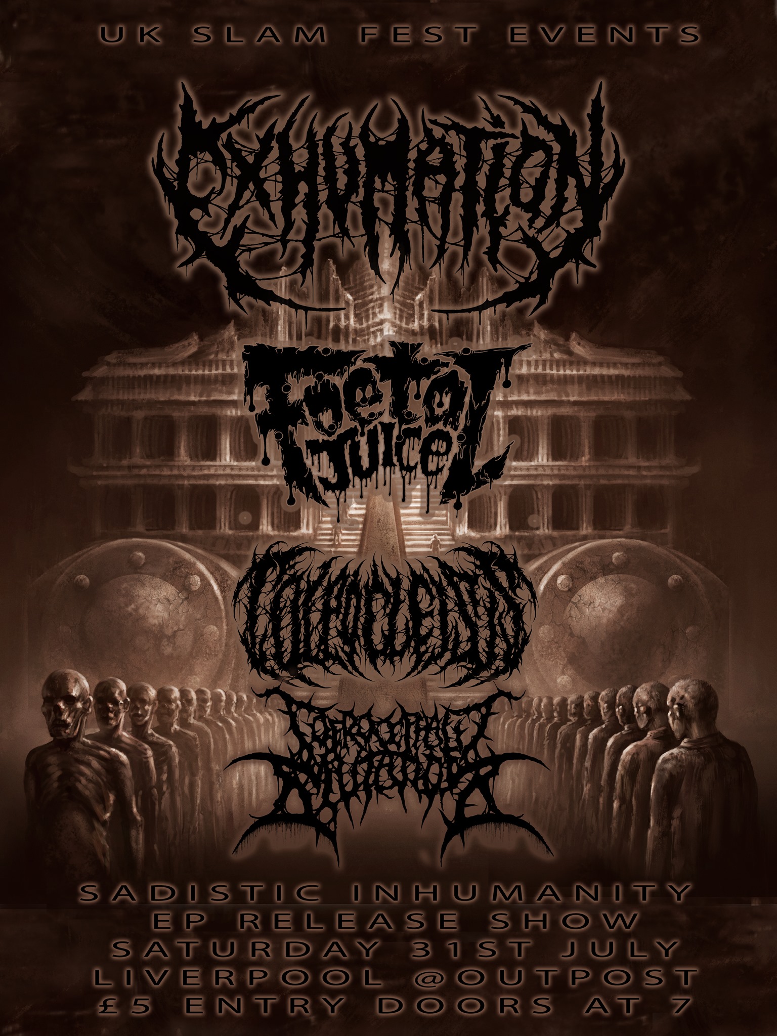 It’s been a long year and a half without proper live music, but here we are, finally back in business. (Hell, it’s been that long since I’ve been to an actual gig that I needed to remind myself how I used to format articles on here!) And what better way to celebrate a return to live music than an intimate, sweaty gig seeing Exhumation, Foetal Juice and Colpocleisis at one of my favourite venues in Liverpool (Outpost sells pizza as well as put on ace gigs, what’s not to like)? Fun fact: the last time I saw these three bands they were also sharing a bill at this very venue in 2018, back when it was still called Maguire’s.